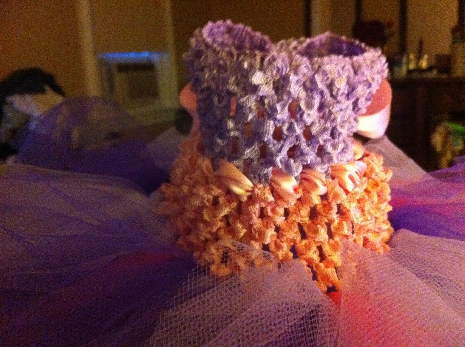 The tutu dress is finished! Took me quite a few hours yesterday, though a lot of that was just indecision on color patterns. I had a problem at the store when buying materials, instead of just being able to grab white crochet bands, they were in color pairs and the white was paired to a dark brown, which wouldn't have worked with the dress at all. They also had purple there, so I decided to grab that. The purple came with pink - not my favorite color combination. But, what else could I do?